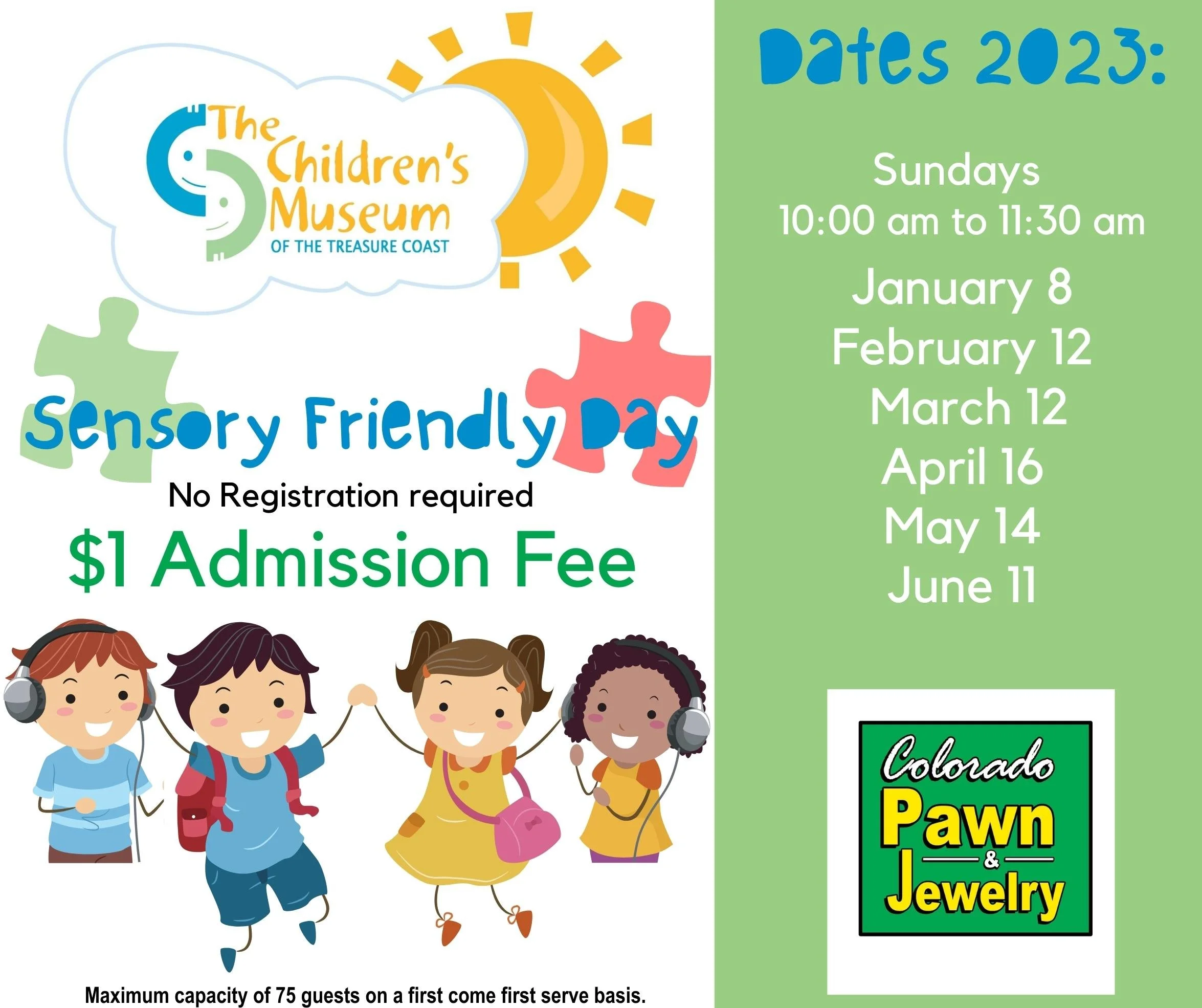 Admission to Sensory Friendly Sunday is $1. No registration required at this time, if capacity is full, Museum will close entry until capacity falls below its max threshold of 75 guests.  Pre-registration may be implemented if monthly capacity rises.